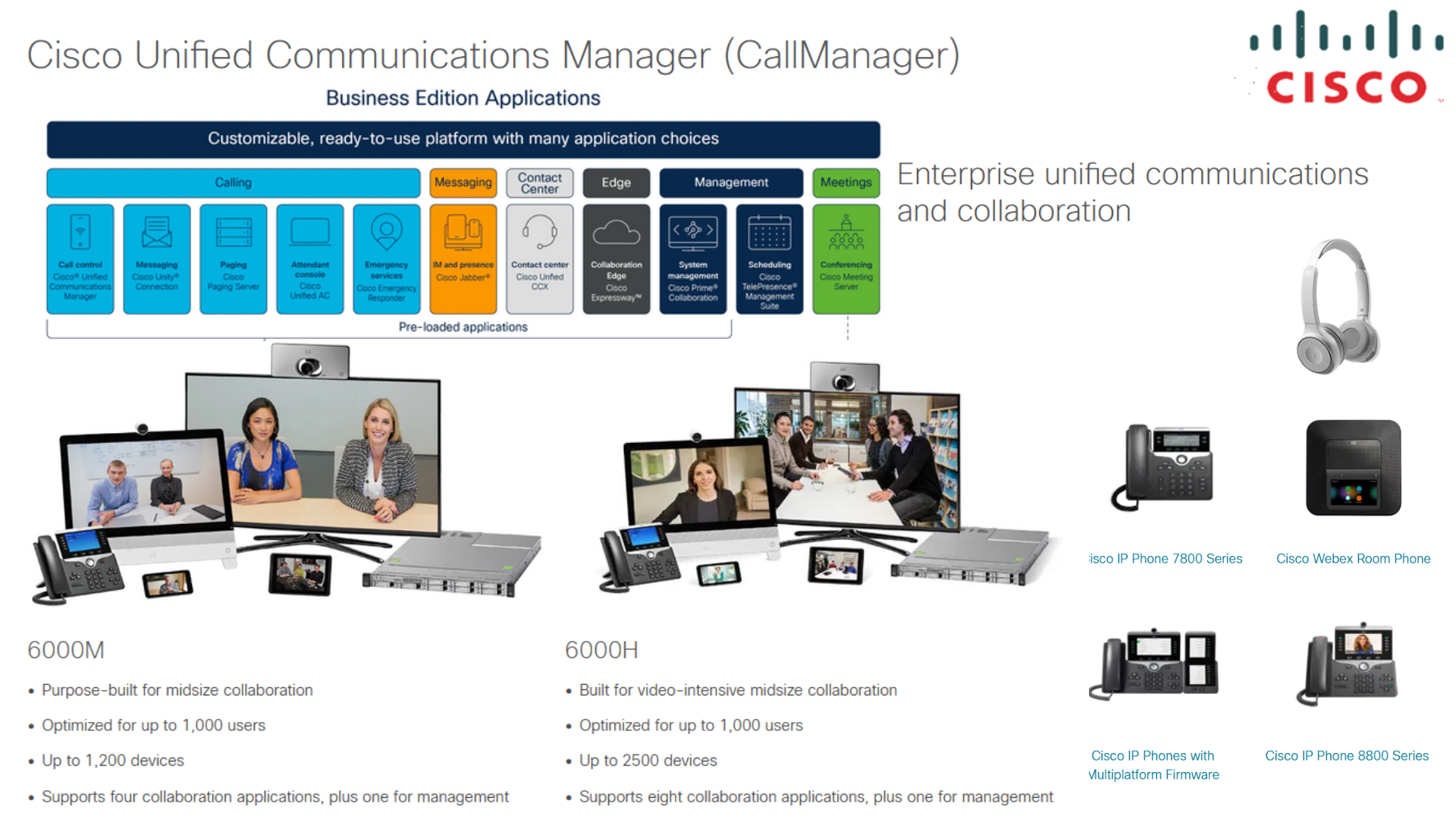 Cisco BE6000 platforms are built on virtualized Cisco Unified Computing System™ (Cisco UCS®) products, which are designed for performance and density over a wide range of company sizes and business workloads. There is one model. It supports multiple applications (typically five to seven) in a single virtualized server platform with a maximum capacity of 1000 users, 1200 devices, and 100 contact center agents. It is ideal for medium-scale, end-to-end collaboration deployments.